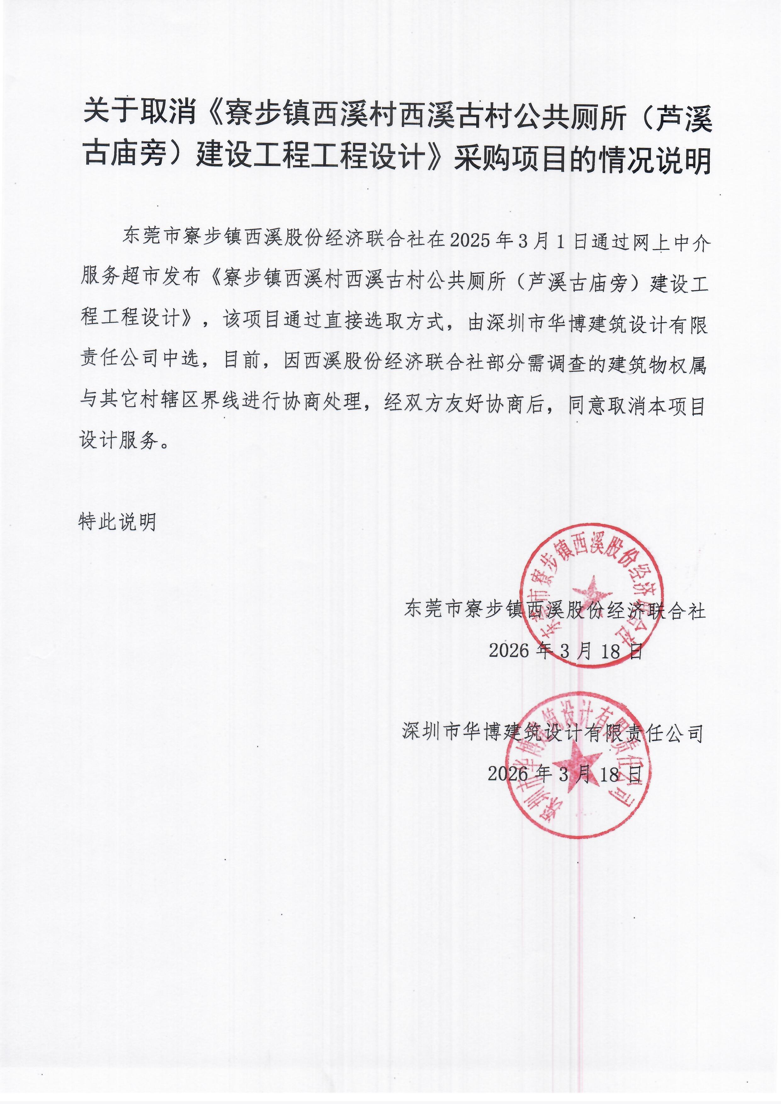 关于[寮步镇西溪村西溪古村公共厕所(芦溪古庙旁)建设工程工程设计]采购失败项目的公示